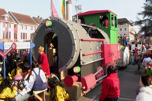Zahlreiche Besucher säumten den Umzugsweg. Die Polizei schätzt ihre Zahl auf rund 10.000. Wohl zum letzten Mal beim Umzug dabei waren "Knorrisch" und "Storrisch", die von einer vielköpfigen "Familie" in rot-weißer Clownaufmachung begleitet wurden. Unter den mehr als 60 Zugnummern waren viele Gruppen und Garden der KG Kuckuck, der KG Urmel, des Club Eulenspiegel und anderer Eberbacher Vereine, Institutionen und Privatinitiativen. Stark vertreten waren auch wieder die "Hirschhorner Ritter" und die Karnevalisten aus Neckargemünd. Auch Teilnehmer aus Sensbachtal, aus dem Ittertal und Waldbrunn waren dabei. Einen der aufwändigsten und schönsten Motivwagen hatten die Karnevalfreunde "Haidebow" gebaut, die Jim Knopfs Lokomotive "Emma" mitsamt dem Bahnhof Lummerland durch Eberbach rollen ließen. Auch der Aufreger Nr 1. in Eberbach, die Großbaustellen und das Tempo ihres Fortschritts, wurden auf die närrische Schippe genommen.