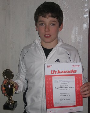 Platz drei bei den Badischen Meisterschaften (Foto: privat)(bro) (br) Am letzten Wochenende fanden die Badischen Tennis-Jugendmeisterschaften in Leimen und Wiesloch statt. Nils Rothenberger vom Tennisclub Blau-Weiß Eberbach hatte sich bei den Hallen Bezirksmeisterschaften mit seinem dritten Platz dafür qualifiziert.