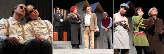 Die alte Dame kam zu Besuch Links Koby und Loby. Mitte: Butler, Claire, Alfred und Lehrer. Rechts Bürger von Güllen. (Fotos:Renate Dengel)(rd) Ausverkauft bis auf den letzten Platz war heute Abend die Stadthalle, als die Badische Landesbühne mit ihrem Stück „Der Besuch der alten Dame“ gastierte.