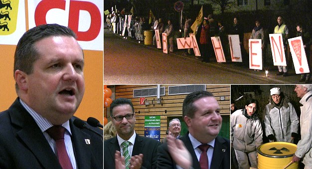 Auf Transparenten und mit Getrommel auf symbolischen Atommüllfässern forderten sie eine Abkehr von der Kernenergie und einen Wechsel der Landesregierung: "Abwählen - Aussteigen" skandierten die Demonstranten. Mappus hat seit seinem Schwenk in der Energiepolitik nach der Atomkatastrophe in Japan für viele ein Glaubwürdigkeitsproblem. Er möchte nach der Wahl in acht Tagen Regierungschef bleiben, was angesichts der aktuellen Umfragewerte im Land aber unsicher ist.