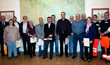 Solidarität unmittelbar zum Ausdruck bringen Unser Bild zeigt die geehrten Blutspender mit Bürgermeister Klaus Schölch (li.) und den DRK-Vertretern Bereitschaftsleiter Joachim Leister (re.) und Claudia Leister (2.v.re.). (Foto: Hofherr)(hof) Nachdem der Neujahrsempfang der Gemeinde Waldbrunn am Dreikönigstag wegen eines Geburtstagsempfangs für Bürgermeister Klaus Schölch zu dessen 60. Wiegenfest in diesem Jahr nicht stattfand, hatten Gemeindeoberhaupt, Sportausschuss und Verwaltung der Winterhauchgemeinde zu einem Ehrenabend geladen. Hierzu begrüßte Schölch neben den zu ehrenden Bürgern auch Landrat Dr. Achim Brötel, Ehrenbürger Gerd Mosca mit Inge Zäpfel und zahlreiche Gemeinde- und Ortschaftsräte im Rathaus in Strümpfelbrunn.