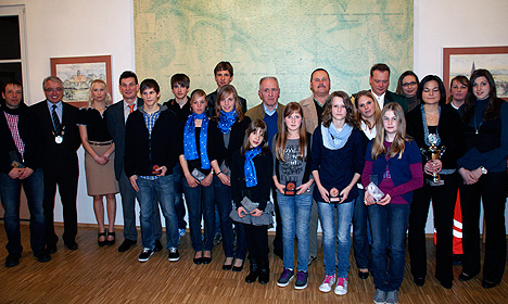 Botschafter für die Winterhauchgemeinde Unser Bild zeigt die geehrten Sportler mit Bürgermeister Klaus Schölch (2.v.li.), Sportausschussvorsitzender Hermann Döring (4.v.li.) und Schriftführerin Anne Simon (3.v.li.). (Foto: Hofherr)