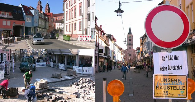 Fußgängerzone auf Zeit in der Bahnhofstraße (Fotos: Claudia Richter)(cr) In der Odenwaldstraße und am Neuen Markt vorbei kann der Verkehr in Eberbach jetzt wieder fließen (unser Bild links oben). Die wochenlange Sperrung wurde am Wochenende aufgehoben. Dafür ist seit heute die Bahnhofstraße Ost gesperrt (rechtes Bild).