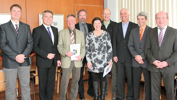 Lange Wegstrecken im Dienste der Bürger Landrat Dallinger (2. v. li.), Manfred Robens (2. v. re.) und Joachim Geiss, Vorsitzende des Personalrates, (re.). (Foto: privat)(bro) (bm) Sieben Dienstjubilare, darunter Manfred Robens aus Schönbrunn, hat Landrat Stefan Dallinger kürzlich bei einer kleinen Feierstunde im Landratsamt geehrt.