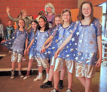 Viele der schmissigen Songs, die von einer jungen Schülerband der Musikschule begleitet werden (einstudiert von Bernahrd Sperrfechter), werden mit Tanzeinlagen optisch aufgewertet. Die kleinen „Schnuppinchen“, die Spatzenchorkinder, haben dabei einen wichtigen Tanz und - wie auch die Planeten - schöne Kostüme, die in Handarbeit ehrenamtlich von Barbara Menges genäht werden.