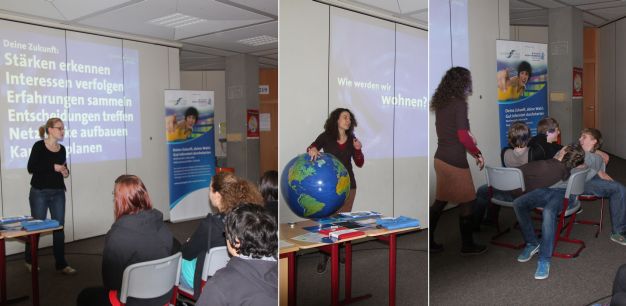 Heute besuchten Silke Fanta und Anna Kempf die Realschule. Dabei hatte die erste von fünf Klassen die Möglichkeit, sich bei einem interessanten multimedialen Programm sowie durch Anschauungsmodelle über viele Möglichkeiten der Berufsfindung ein Bild zu machen. Doch nicht nur zuhören, sondern auch mitmachen war gefragt. Acht verschiedene Themenbereiche wie z.B. Wohnen, Leben retten, Kommunikation, Umwelttechnik usw. wurden den Schülerinnen und Schülern zur Verfügung gestellt. Daraus konnten sie sich verschiedene Interessengebiete heraussuchen und wurden durch zukunftsorientierte Kurzvideos, Bilder, Modelle und interessante Vorträge der beiden Wissenschaftlerinnen informiert.
