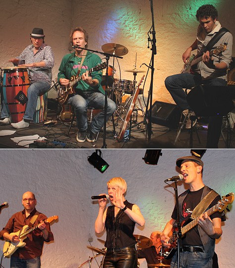 World Slide und Get the Cat in der Galerie Artgerecht Bild oben von links: Karl Kempf (Percussions), Jan Lindqvist (Gitarre u. Gesang) und Paul Zeiss (Bass) von "World Slide". "Get the Cat" mit Philipp Roemers (Gitarre u. Gesang), Astrid Barth (Gesang), Ralph Schläger (Drums) und Till Brandt (Bass u. Gesang).(Fotos:Wörner)(tw) Zur Bluesnight hatte das Kulturlabor Eberbach am Freitag eingeladen. Über dreieinhalb Stunden spielten zwei ganz gegensätzliche Formationen in der Galerie Artgerecht