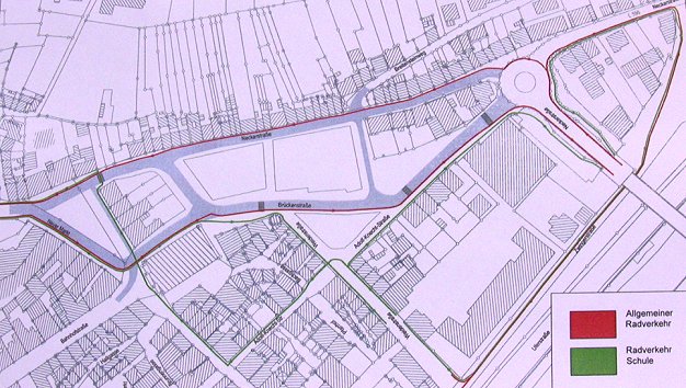 In der Grafik ist die künftige Radverkehrsführung zu sehen. Rote Linien gelten für den allgemeinen Fahrradverkehr, grüne Linien für Kinder bis 10 Jahren. Die gestern beschlossenen Regelungen sollen zunächst probeweise für ein Jahr gelten.