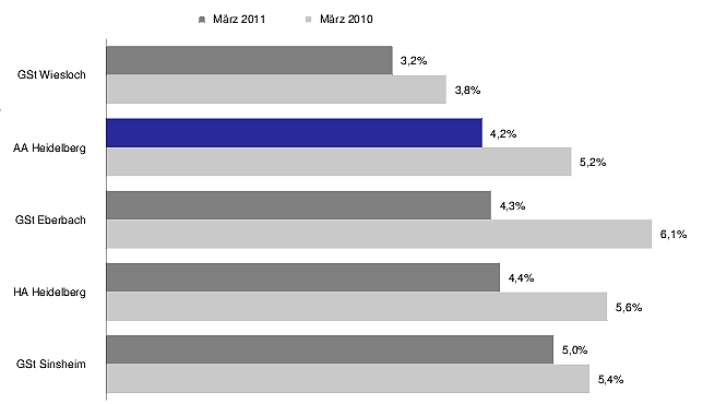 Regionaler Arbeitsmarkt ist stabil Arbeitslosenquoten im März 2011. (Grafik: Bundesagentur für Arbeit) (bro) (aa) Ende März waren im Bezirk der Agentur für Arbeit Heidelberg 9.087 Menschen arbeitslos gemeldet - 98 weniger als im Februar und 2.155 weniger als vor einem Jahr. Die Arbeitslosenquote im Gesamtbezirk beträgt unverändert 4,2 Prozent. Vor einem Jahr waren es noch 5,2 Prozent.
