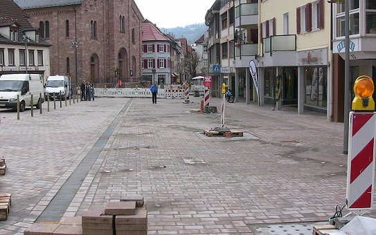 Dem Ostershopping steht vermutlich nichts im Wege Der Fahrstreifen (links) und die Kurzzeitparkplätze auf dem Neuen Markt sind fast fertig. (Foto: Hubert Richter)(hr) Gute Nachrichten konnte Timo Mechler vom Stadtbauamt heute beim Baustellengespräch im Bürocontainer an der Brückenstraße verkünden: Die Arbeiten am Neuen Markt und vor der Evangelischen Kirche liegen im Zeitplan, der lange Einkaufsabend "XXL-Ostershopping" am 15. April kann vermutlich wie geplant stattfinden.