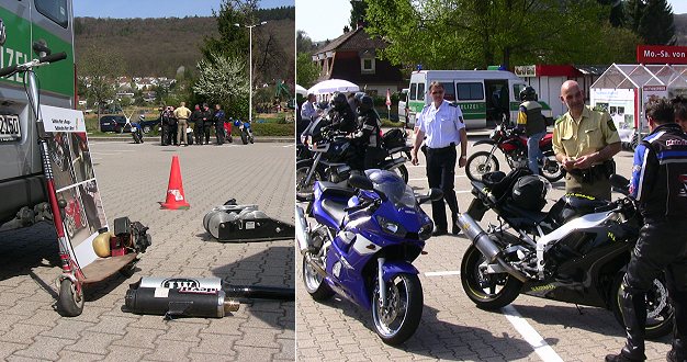 Information und Gespräche standen heute auch bei einer großen länderübergreifenden Kontrollaktion auf dem Parkplatz eines Einkaufmarktes an der B 37 in Neckargemünd-Kleingemünd im Mittelpunkt (unsere Bilder). Beamte der Verkehrspolizei Heidelberg und Kollegen aus Südhessen nahmen Hunderte Biker und ihre Maschinen unter die Lupe. Überprüft wurde der technische Zustand der Zweiräder, aber auch die Sicherheitsausstattung der Fahrerinnen und Fahrer. Am meisten zu mehr Verkehrssicherheit können die Motorradfahrer nämlich selbst beitragen. Fahrsicherheitstraining, technisch einwandfreie und verkehrssichere Motorräder, die richtige Schutzkleidung und eine vernünftige und vorsichtige Fahrweise sind wichtige Kriterien für unfallfreien Fahrspaß.