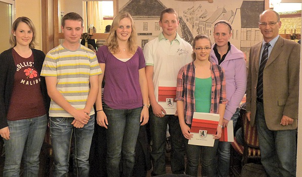 Neuwahlen verjüngen den Vorstand weiter Bürgermeister Gottfried Görig (ganz re.) und die geehrten Kreismeistersieger (v.r.): Kim Kroh, Alisa Horn und Philipp Riesinger, sowie der Platzierten Katharina Riesinger, Erik Löb und Julia Spilger. (Foto: privat)(bro) (rau) Am Freitag fand die Jahreshauptversammlung des Reit- und Fahrvereins Oberzent im Beerfeldener Gasthaus „Schwanen“ statt. Da Neuwahlen auf dem Plan standen und die Abzeichen aus dem Frühjahrskurs übergeben wurden, war der Besuch recht ordentlich.
