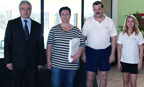 Jubiläumsgast kommt aus Eberbach Christiane Grimm (2.v.li.) aus Eberbach wurde von Bürgermeister Klaus Schölch (li.), Betriebsleiter Paul Scholl (2.v.re.) und Bademeisterin Christine Braun (re.) als 50.000 Gast der Katzenbuckel-Therme begrüßt. (Foto: Marina Hofherr)(hof) Aus Eberbach kam der 50.000 Gast, der am Donnerstag in der Katzenbuckel-Therme begrüßt wurde.