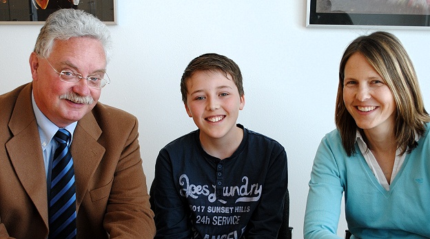 Jüngster Erdkunde-Schulsieger nun auf Platz sieben im Südwesten Oberstudiendirektor Helmut Schultz (r.) mit Maximilian Schöner und der verantwortlichen Studienrätin Jutta Hertlein. (Foto: privat)(bro) (pm) Eine kleine Sensation brachte der diesjährige Erdkundewettbewerb „National Geographic“ am Eberbacher Hohenstaufen-Gymnasium (HSG) im April: Nachdem Maximilian Schöner aus der Klasse 7b als einer der jüngsten Teilnehmer Schulbester geworden war, erreichte er in der Landeswertung einen siebten Platz - und dabei hatte Maximilian Schöner die gleichen Fragen zu beantworten, wie die Schülerinnen und Schüler aller Altersstufen in ganz Baden-Württemberg.