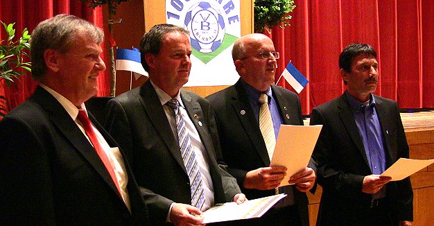 Unterhaltsamer Festabend bildete den Auftakt zu den Jubiläumsfeiern Johannes Kolmer (Fußballkreis Heidelberg) mit den Geehrten Joachim Scheible, Peter Huck und Michael Stumpf (v.l.). (Foto: Hubert Richter)Mehr Bilder (Klicken zum Vergrößern):