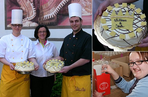"Seit Beginn der Hochzeitsvorbereitungen in England wird auch bei uns die William & Kate - Hochzeitstorte aus Zutaten wie Marzipan, Cointreau- und Orangencreme produziert", so der Konditormeister. Ein Exemplar wird in der nächsten Woche gut verpackt die Reise nach England antreten und soll pünktlich am 29. April auf dem Geschenketisch des königlichen Hochzeitspaares liegen.
