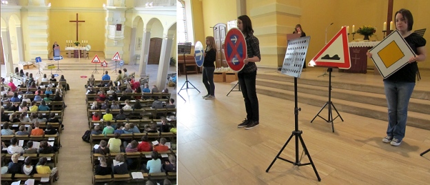 Passionsgottesdienst am letzten Schultag vor den Osterferien Links: Blick in die gut besuchte Michaelskirche. Rechts: Pfarrerin Heike Vierling-Ihrig und die Religions-AG stellen den Kreuzweg Jesu in einem neuen Gewand den Zuhörern dar. (Fotos: privat)(bro) (pm) Der letzte Schultag am Hohenstaufen-Gymnasium wurde mit einem Passionsgottesdienst in der gut besuchten Michaelskirche eröffnet. Die Religions-AG unter der Leitung von Pfarrerin Vierling-Ihrig hatte ihn für die Schulgemeinschaft vorbereitet. Thematisch ging es um den Kreuzweg Jesu. Anhand unterschiedlicher Verkehrszeichen wurde der Leidensweg Jesu von den Mitgliedern der Religions-AG engagiert in die heutige Zeit übersetzt und verständlich gemacht. Nachdenklich ging es dann in die Schule, wo am Nachmittag endlich die ersehnten Osterferien begannen.
