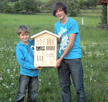 Natur aktiv erleben (Foto: privat)(bro) (rup) Einen guten Gedanken für die Natur in Pleutersbach hatten die Brüder Michi und Daniel Metzger. Sie bauten zwei Insektenhotels in den Osterferien und hängen sie nun an geeigneten Orten in der Pleutersbacher Landschaft auf. Angeregt von den Diskussionen über den Erhalt der Landschaft und der Streuobstwiesen in ihrer Nachbarschaft wollten sie einen positiven Beitrag leisten. Der Finanzier war schnell gefunden. Ist es doch Vater Rainer Metzger, der die Kasse des Heimat- und Verkehrsvereins Pleutersbach leitet, und diese für den guten Zweck öffnete. Wanderer und Spaziergänger können nun in Zukunft das lebendige Treiben vor den Insektenhotels beobachten.