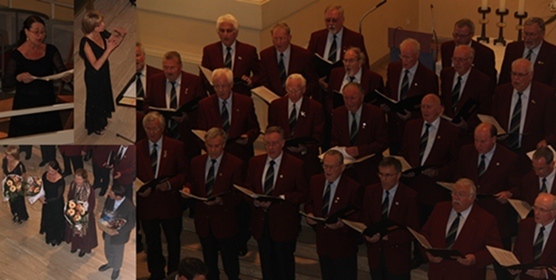 Jauchzet Gott alle Lande! Links.Dorothea Feuerstein-Metternich, Karin Conrath. Rechts der Chor, links unten Karin Conrath, Solistinnen und Achim Plagge. (Fotos:Renate Dengel)(rd) Wunderbare Klänge von Alt bis Sopran ließen die Michaelskirche heute Abend beim Benefizkonzert des MGV Liederkranz in besonderem Glanz erstrahlen.