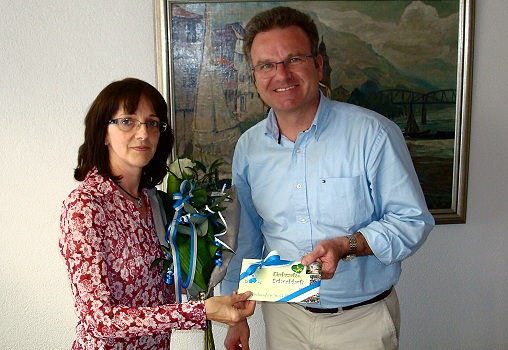 Fachwerk und Fluss - Natur und Genuss (Foto: privat)(bro) (stve) Diese Tage überreichte Bürgermeister Bernhard Martin einen EWG Gutschein und ein Blumenpräsent an Ulrike Rothfuß. Die gebürtige Schwäbin, die seit sieben Jahren mit ihrer Familie in Eberbach wohnt, hatte die Idee zum Slogan „Fachwerk und Fluss - Natur und Genuss“, der vom Gemeinderat Ende Februar ausgewählt wurde. Dieser wird sich künftig in allen neuen Plakaten, Prospekten und Flyern der Stadt Eberbach wiederfinden.