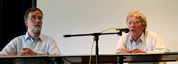 Zeitzeuge zog Schüler in seinen Bann V.l.: Geschichtslehrer Bernhard Schell und Professor Manfred Görlach. (Foto: Peter Krauch)(pck) Am vergangenen Dienstagmorgen konnte Oberstudiendirektor Helmut Schultz in der vollbesetzten Aula des Hohenstaufen-Gymnasiums einen besonderen Zeitzeugen, den emeritierten Professor Manfred Görlach, begrüßen, der über seine Zeit als Fluchthelfer in der DDR referierte.