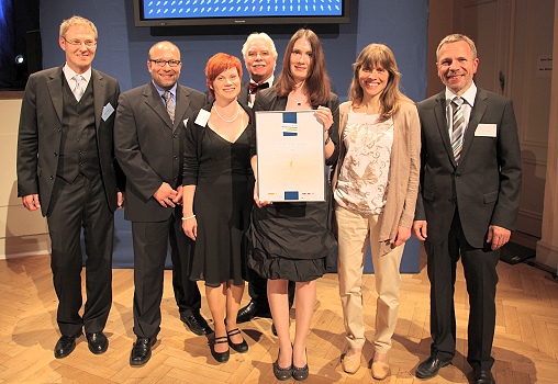 Erster Platz bei Deutschlands Kundenchampions 2011 V.l.: Roman Becker, Geschäftsführer forum! Marktforschung, Eberhard Reiner, Evi Georg, Dr. Wolfgang M. Kaerkes, Geschäftsführendes Vorstandsmitglied Deutsche Gesellschaft für Qualität e.V., Sonja Teichtinger, Angelika Merkel und Frank Knecht. (Foto:"Quelle: forum! Marktforschung GmbH/Klaus Schilling)(bro) Am 10. Mai standen im Kurfürstlichen Schloss zu Mainz Unternehmen im Mittelpunkt, die sonst ihre Kunden in den Mittelpunkt stellen. In einem feierlichen Rahmen wurden Deutschlands Kundenchampions 2011 geehrt.