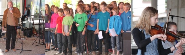 Viel Musik und gute Laune Bild links Schulleiter Helmut Schultz. Mitte: Unterstufenchor, Bild rechts Geigenspielerin der Folkband "Sambady". (Fotos: Renate Dengel)(rd) Eigentlich muss man am Sonntag nicht in die Schule gehen. Trotzdem war das Hohenstaufen-Gymnasium gestern sehr gut besucht. Grund dafür war allerdings kein Unterricht, sondern der traditionelle musikalische Frühschoppen der Freunde des HSG.