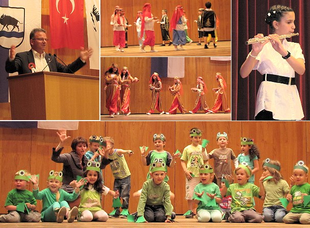Ein reiches und ausgiebiges Unterhaltungsprogramm erwartete schließlich das zahlreiche kleine und große Publikum. Von musikalisch unterlegten Diashows über verschiedene orientalische Volkstanzvorführungen in farbenfrohen Trachten. Auch einige Musikgruppen bereicherten mit traditionellen Instrumenten und tiefsinniger türkischer Volksmusik (Baglama) das Fest. Die Realschülerin Sedef spielte auf ihrer Querflöte, und der Kindergarten Arche Noah entzückte mit einem bekannten türkischen Kinderlied vom kleinen Frosch, das die Kinder auf Türkisch einstudiert hatten.