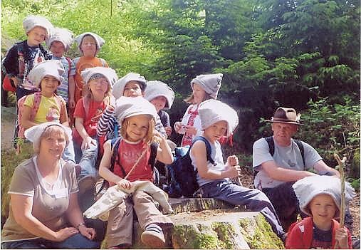Auf den Spuren der Hölzerlipsbande (Foto: privat)(bro) (schs) Unter der Leitung von Fritz Kaufmann erlebten die Schulanfänger des evangelischen Kindergartens Arche Noah vor kurzem einen spannenden Tag in den Wäldern rund um Mülben. Sie wanderten gemeinsam auf den Spuren des Räuberhauptmanns Hölzerlips, der Anfang des 19. Jahrhundert mit seiner Räuberbande den hohen Odenwald unsicher machte.