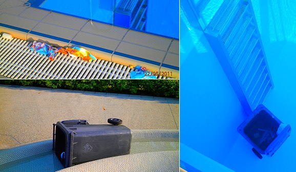 Mülleimer im Becken versenkt und Sitzbänke beschädigt (Fotos: privat)(hr) Vandalen trieben in der vergangenen Nacht im Eberbacher Freibad ihr Unwesen.