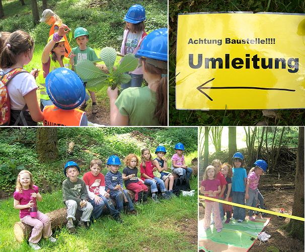 Am Waldklassenzimmer startete die Baustellenbegehung. In Kleingruppen gab es sieben Bauabschnitte passend zu den sieben Tagen der Schöpfung zu erkundschaften. Die erste Baustelle musste mit verbundenen Augen erforscht werden, hell und dunkel wurde erlebt. Die zweite Baustelle war sehr wackelig: Die Kinder machten die Erfahrung, wie es zwischen Himmel und Erde ist, indem sie über eine Slackline balancierten. Bei den weiteren vier Bauabschnitten entdeckten sie schöne „Bauwerke der Natur“ - z. B. verschiedene Bäume, Pflanzen und Tiere, bastelten Sterne aus Zweigen und formten Tonmännchen. Die Kinder prüften die Umgebung ganz genau mit einer Lupe und schauten unter jeden dicken Stein, um auch nichts zu übersehen. Besonders die Molche im Bach, riesige Kastanienblätter und der reichlich vorhandene Matsch hatten es den Kindern angetan. Die kleinen "Ingenieure" waren begeistert von der Baustelle der Natur. Das Highlight war dann die göttliche Erfindung des Wassers. Dort zeigten die kleinen "Ingenieure" ihre Fähigkeiten, Staudämme und sonstige Bauwerke zu entwerfen und waren den ganzen Mittag nicht mehr von ihrer Baustelle wegzubekommen. Der siebte Baustellenabschnitt war am Baucontainer (Waldklassenzimmer), wo passend zum siebten Schöpfungstag, der ja der Ruhe gewidmet ist, ein deftiges Vesper wartete.
