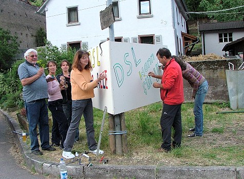 Bei dieser Beschriftungsaktion machte eine interessante Nachricht die Runde: Seit vergangenen Freitag könne Lindach über „DSL light“ ins Netz. Ortschaftsrat Enrico Amici machte sich unverzüglich schlau. Und er erfuhr von der Telecom, dass einige wenige Bürger jetzt tatsächlich "DSL light" nutzen können. Aber nur soweit, wie sie vom jetzt verstärkten Zwingenberger Netz noch profitieren können. Die Leistung sei zwar, wie der Name schon sagt, recht schwach, aber sie sei, was ja auch schon ein Vorteil ist, über Flatrate nutzbar. Amici informierte unverzüglich per E-Mail Bürgermeister Bernhard Martin über den neuesten Stand der Dinge und mahnte dabei auch die bereits vor Wochen versprochene Bürgerversammlung in dieser Angelegenheit an. Außerdem fragte er an, ob die Stadt bereits Kontakte mit der entsprechenden Hotline aufgenommen und mit den Ansprechstellen dort eine Wirtschaftlichkeitsstudie durchgeführt habe.