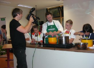 Hessischer Starkoch brutzelte in der Aula (Foto: privat)(cr) (hiho) Einen ganz besonderen Gast konnten die Kinder der 5. und 6. Klassen in Neckarsteinach am Mittwoch vergangener Woche erleben: Aus Frankfurt war Mirko Reeh in die Freiherr-vom-Stein-Schule gekommen, um mit Kindern des Kochclubs „Golden Chefs“ ein gesundes Drei-Gänge-Menü zu zaubern - vor Publikum.