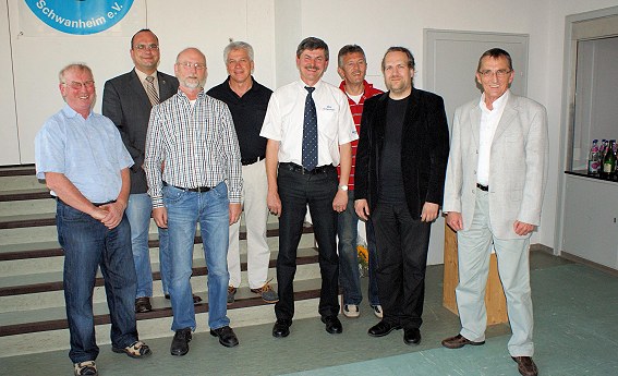 MGV Schwanheim stellt neuen Dirigenten vor Bürgermeister Jan Frey (2.v.l.) und Wilfried Kappel (Mitte) mit Mitgliedern des MGV Schwanheim sowie den neuen Dirigenten Frank Aranowski (2.v.r.) und Adolf Holzmann (r.). Hintere Reihe Mitte Andreas Walz, der verabschiedet wurde. (Foto: Reinmuth)(hr) (at) Der Männergesangverein Schwanheim konnte mit Frank Christian Aranowski die ausgeschriebene Chorleiterstelle neu besetzen. Der neue Chorleiter wurde am vergangenen Donnerstag in einer kleinen Feierstunde im Dorfgemeinschaftshaus der Öffentlichkeit vorgestellt.