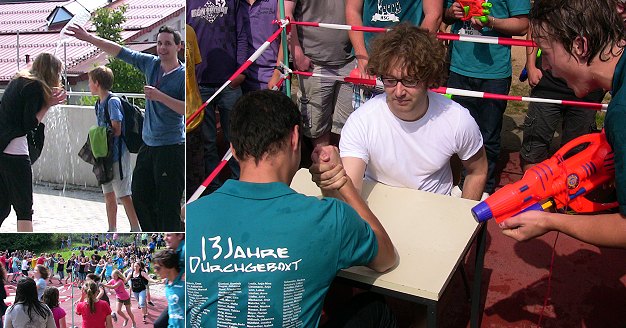 Mit Trillerpfeifen und Wasserspritzpistolen stürmten die Abis die Gebäude, "befreiten" die Schüler und sorgten dafür, dass keine Lehrkraft mehr einen geregelten Unterricht durchführen konnte. Einen Wermutstropfen hatte die ganze Aktion aber doch, denn beim Verlassen der Räumlichkeiten wurde fast jeder Opfer eines Wasserangriffs durch die Schulabgänger. Unter dem diesjährigen Abi-Motto "Muhammad Abi - 13 Jahre durchgeboxt" wurde anschließend auf dem Sportgelände des HSG sportlich Party gefeiert, bei der auch Schulleiter Helmut Schultz und einige Lehrerinnen und Lehrer den Mut zur Teilnahme an der Polonaise, am Parcours oder beim Armdrücken bewiesen.