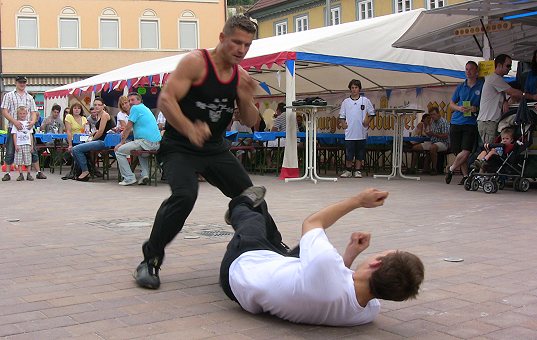 Tausende Besucher strömten in die Innenstadt Keine Schlägerei unter Festbesuchern, sondern eine Kampfkunstvorführung auf dem Neuen Markt: "Wing Tsun". (Foto: Hubert Richter)Mehr Bilder (Klicken zum Vergrößern):