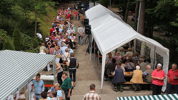 Ein großer Teil der Tischgarnituren im Freien war in Zelten untergebracht, so dass man für jedes Wetter gerüstet war. Um die Mittagszeit wurde es richtig eng, von allen Seiten strömten hungrige und durstige Wanderer herbei. Die MGVler hatten sich auf den Ansturm aber gut vorbereitet. Ob der Sinn mehr nach Kaffee und Kuchen oder aber nach deftiger Kost vom Grill stand, wieselflink wurden die Bestellungen aufgenommen und erledigt. Die volkstümliche Stimmungsmusik der kleinen Egerländer sorgte für gute Laune und Gemütlichkeit.