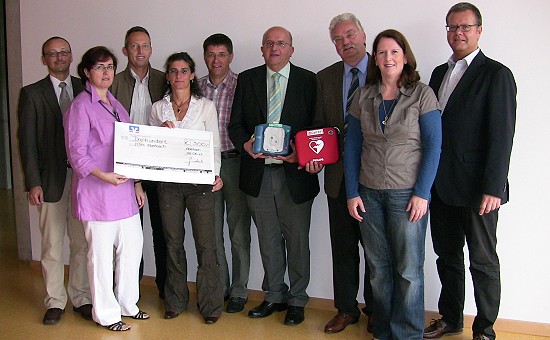 Nach diesem Rundgang, bei dem viele alte Erinnerungen geweckt worden seien, sei man zum gemütlichen Teil übergegangen, bei dem unter anderem von den Teilnehmern des Abi-Treffens eine Spendenaktion für das HSG beschlossen worden sei, so Armin Grein vom Organisationsteam des Abi-Treffens. "Wir wollen mit einer Spende unsere fortwährende Verbundenheit mit dem HSG zum Ausdruck bringen" erklärte Grein. In den Genuss des Spendenerlöses kamen heute sowohl die Schulleiter als auch Bettina Greif, Vorsitzende des Vereins "Freunde des Hohenstaufen-Gymnasiums". Sie erhielt aus den Händen einer Abordnung der Abis 1981 für den Verein einen Scheck in Höhe von 300 Euro. Über einen Defibrillator inklusive Schrank, Erste-Hilfe-Ausstattung und Einführungskurs für bis zu 15 Personen im Gesamtwert von rund 1.400 Euro dürfen sich Schultz und Huck freuen.