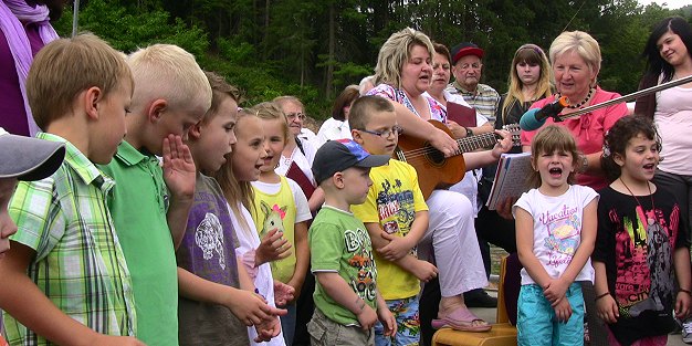 Symbolisches Band der Trennung durchschnitten Der Kindergarten Zwingenberg beim Liedvortrag. (Foto: Hubert Richter)Mehr Bilder (Klicken zum Vergrößern):