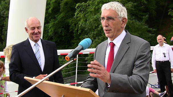 Beim gestrigen Festakt konnte Bürgermeister Kirchesch neben Landrat Dr. Achim Brötel und Regierungspräsident Dr. Rudolf Kühner die Landtagsabgeordneten Peter Hauk (CDU) sowie Georg Nelius und Rosa Grünstein (beide SPD) begrüßen. Der Brückenbau war vor allem wegen des landschaftlichen Eingriffs im Neckartal stark umstritten. Eine Petition des NABU gegen das Projekt wurde vor vier Jahren vom Petitionsausschuss des Landtags zurückgewiesen. Damit und nach einem Vergleich vor dem Verwaltungsgerichtshof Mannheim (wir berichteten) war der Weg für die vom Zwingenberger Gemeinderat bereits im Jahr 1999 beschlossene Brücke frei.