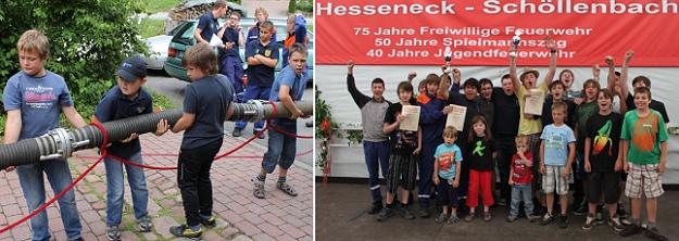 Dreifache Jubiläumsfeier der Freiwilligen Feuerwehr und des Spielmannszuges Der Jungfeuerwehrnachwuchs aus Schöllenbach-Kailbach und die Sieger-Mannschaften aus Nieder-Kainsbach und Reichelsheim.(Fotos:Wörner/jf-OWK)(tw) In Verbindung mit dem Kreisfeuerwehrtag des Odenwaldkreises 2011, der in Hesseneck-Schöllenbach stattfindet, feiert die Freiwillige Feuerwehr und der Spielmannszug Schöllenbach bis zum kommenden Sonntag ein dreifaches Jubiläum. 75 Jahre Freiwillige Feuerwehr Schöllenbach, 50 Jahre Spielmannszug Schöllenbach und 40 Jahre Jugendfeuerwehr Schöllenbach.