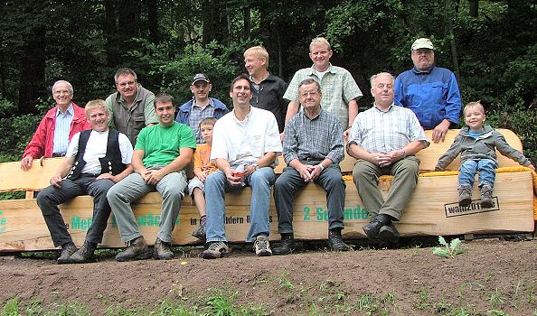 Holzquader lädt zum Ausruhen ein Bei der Einweihung wurde die Bank von Matthias Prexl vom Kreisforstamt, der auch Geschäftsführer der FBG Kleiner Odenwald (Mitte) ist, und den Lindacher Bank-Stiftern Werner Helm, Achim Helm, Fritz Lehr, Wolfgang Helm, Nico Helm, Karl-Heinz Neureuther, Christof Diehl, Markus, Volker Morr und Gerhard Helm getestet. (Foto: privat) (bro) Fünf ungewöhnliche Sitzgelegenheiten, je fünf Meter lang, 45 Zentimeter breit und hoch - aus genau einem Kubikmeter Holzmasse, wurden kürzlich in der Region aufgestellt (wir berichteten).