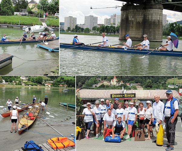 Wanderfahrt auf der Donau (Fotos: Ellen Wartner)(bro) (ewa) Nein blau war sie nicht, die Donau. Aber "Donauwellen" gab es, die man mit den Ruderbooten, sofern sie geschickt manövriert wurden, regelrecht abreiten konnte. Immer dann, wenn Frachtschiffe, luxuriöse Kreuzfahrtschiffe, Ausflugsboote oder die zahlreichen kleinen Yachten vorbeizogen. Am Pfingstsonntag hatte man sich - 16 Ruderinnen und Ruderer von der RGE - mit zwei Kleinbussen und dem Hänger voller Boote auf große Wanderruderfahrt an die Donau begeben.