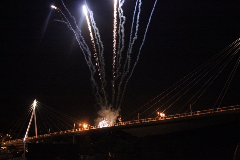 Eine atemberaubende Performance boten die Event-Künstler der Gruppe "artArtistica" mit Show-Elementen und ihren Feuer- und Licht- Illuminationen. Als "Seebühne" diente aus Sicherheitsgründen ein Schwimmponton, der etwa acht Meter vom Ufer entfernt im Neckar befestigt war. Trotz des Sicherheitsabstands wurde es den Zuschauern direkt am Ufer reichlich warm. Die Künstler bekamen minutenlangen Beifall, bevor sie ihre Show fortsetzten und den Brückenkörper hoch über dem Festgelände mit Feuerschalen beleuchteten.