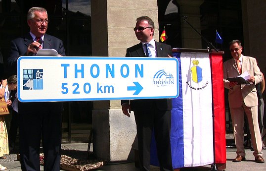 Zentrale Veranstaltung war am Samstagvormittag vor dem Rathaus die Jubiläumszeremonie mit Festreden der beiden Bürgermeister Jean Denais und Bernhard Martin, die eine Partnerschaftscharta unterzeichneten und damit den Willen bekundeten, die freundschaftliche Verbindung der beiden Städte fortzusetzen und zu fördern. Bernhard Martin hielt seine Festrede vollständig auf Französisch und überreichte anschließend als Gastgeschenk ein Glasbild der Eberbacher Künstlerin Martina Mechler-Flachs. Jean Denais schenkte seinem Eberbacher Amtskollegen ein Schild "Thonon 520 km", das demnächst in Eberbach den Weg in die Partnerstadt weisen soll. Musikalisch begleitet wurde der Festakt unter anderem durch die Thononer Musikschule, die bekannte Kapelle "Harmonie Chablaisienne" und die beiden Eberbacher Kirchenchöre, die zusammen mit dem Thononer Chor "Amédée" die Nationalhymnen und die Europahymne (Beethovens "Ode an die Freude") sangen.