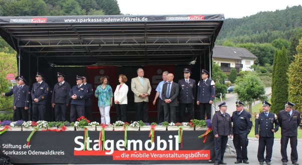 Etwa 900 Teilnehmer zählte der Festzug, der gestern Nachmittag am Rathaus in Hesseneck – Schöllenbach Aufstellung nahm. Mit musikalischer Begleitung durch die teilnehmenden Musikgruppen und Spielmannszüge ging es entlang der festlich geschmückten Siegfriedstraße vorbei an der Tribüne mit Ehrengästen zum Festplatz am anderen Ende des Ortes. Abordnungen von 41 Feuerwehren sowie sieben Musikkapellen und Spielmannszüge waren gekommen um mit den Schöllenbachern Jubiläum zu feiern. Nach dem Festumzug waren die Sitzplätze im Festzelt und im gemütlich hergerichteten Außenbereich bis auf den letzten Platz belegt. Mehr als 1500 Besucher mussten bewirtet werden, eine logistische Meisterleistung für die 240 Einwohner zählende Ortschaft. Wie unser Internet Magazin weiter vom 1. Vorsitzenden der FFW Schöllenbach Karlheinz Ihrig erfahren konnte, arbeiteten während der Festtage 252 Helfer in 404 Arbeitsschichten, Auf- und Abbauzeiten nicht mit eingerechnet.