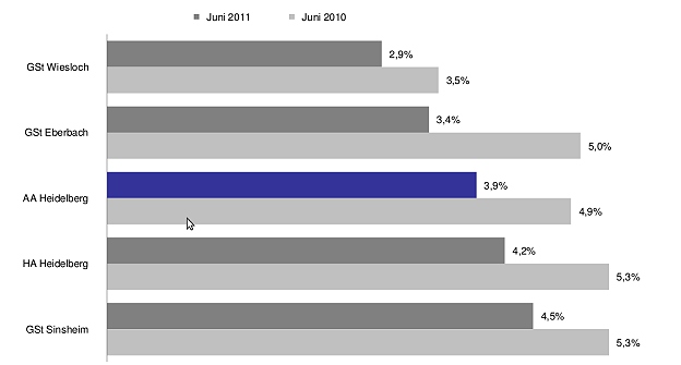 Erfreuliche Arbeitsmarktentwicklung auch im Juni Arbeitslosenquoten im Juni 2011. (Grafik: Bundesagentur für Arbeit)(bro) (aa) Ende Juni waren im Bezirk der Agentur für Arbeit Heidelberg 8.465 Menschen arbeitslos gemeldet - 234 weniger als im Mai und 2.114 weniger als vor einem Jahr. Die Arbeitslosenquote im Gesamtbezirk ging um 0,1 Prozent zurück auf 3,9 Prozent. Vor einem Jahr waren es noch 4,9 Prozent.