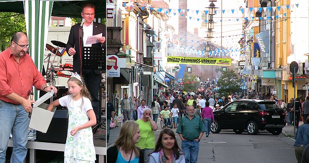 Langer Einkaufsabend mit Musik und Genuss Bärlauchprinzessin Lea Marie Müller zog die Gewinner des Frühlingsfest-Suchspiels, unterstützt von Bernhard Walter (l.) und Bürgermeister Bernhard Martin. Viel Betrieb herrschte am Abend in der Bahnhofstraße. (Fotos: Hubert Richter)Mehr Bilder (Klicken zum Vergrößern):