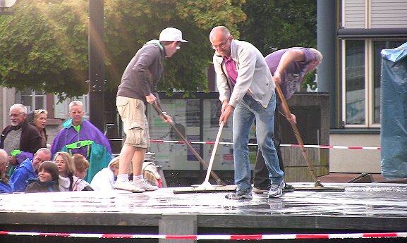 Langer Einkaufsabend mit Musik und Genuss Nach dem Regen wurde auf dem Leopoldsplatz erst einmal die Theaterbühne vom Wasser befreit. (Foto: Hubert Richter)Mehr Bilder (Klicken zum Vergrößern):