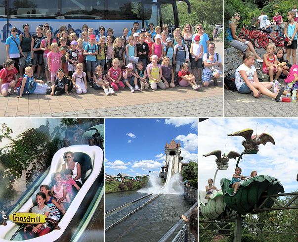 Auf dem Busparkplatz wurde schnell das Gruppenfoto gemacht, die Getränkeflaschen ausgeteilt, und schon ging es los. Die Gruppen erkundeten den ganzen Park mit seinen vielen Attraktionen. "Mammut", "rasender Tausendfüßler", "Badewannenfahrt", "G´sengte Sau" und Waschzuberrafting waren nur einige Favoriten der Gruppen. Schnell verging die Zeit und immer wieder trafen sich die kleinen Gruppen beim Anstehen und tauschten Infos bezüglich der Rallye-Fragen aus. Viel zu schnell wurde es Abend, und man traf sich zum Abschluss am "Maibaum", um diesen gemeinsam zu fahren. Danach gab es für alle noch ein Eis, und gegen 17.50 Uhr ging es zurück zum Bus.